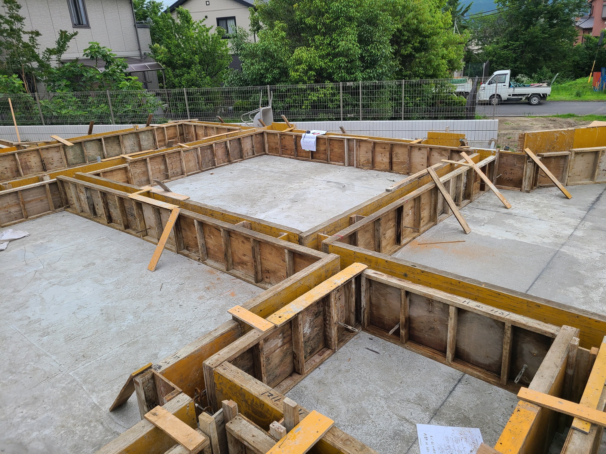 2024年1月25日 2023.11.03 竣工 2023.10.9 クロス工事 2023.9.26 階段手摺施工 2023.9.20 内部造作・装飾塗装 2023.9.9 大工工事立会 2023.9.9 外部造作 2023.8.29 装飾キャノピー 2023.8.13 外部装飾工事 2023.8.9 内部造作工事 2023.8.1 断熱施工 2023.7.25 防水工事 2023.7.16 上棟立会い 2023.7.14 2023.7.12 屋根下地 2023.7.5 1階フレーミング工事 雨のため、養生しながらブルーシートの下で作業をしています。 2023.6.21 基礎工事完了 2023.6.15 型枠工事 2023.6.13 基礎配筋工事 2023.5.31 湿式柱状改良工事 杭の墨出し ブログ一覧へ